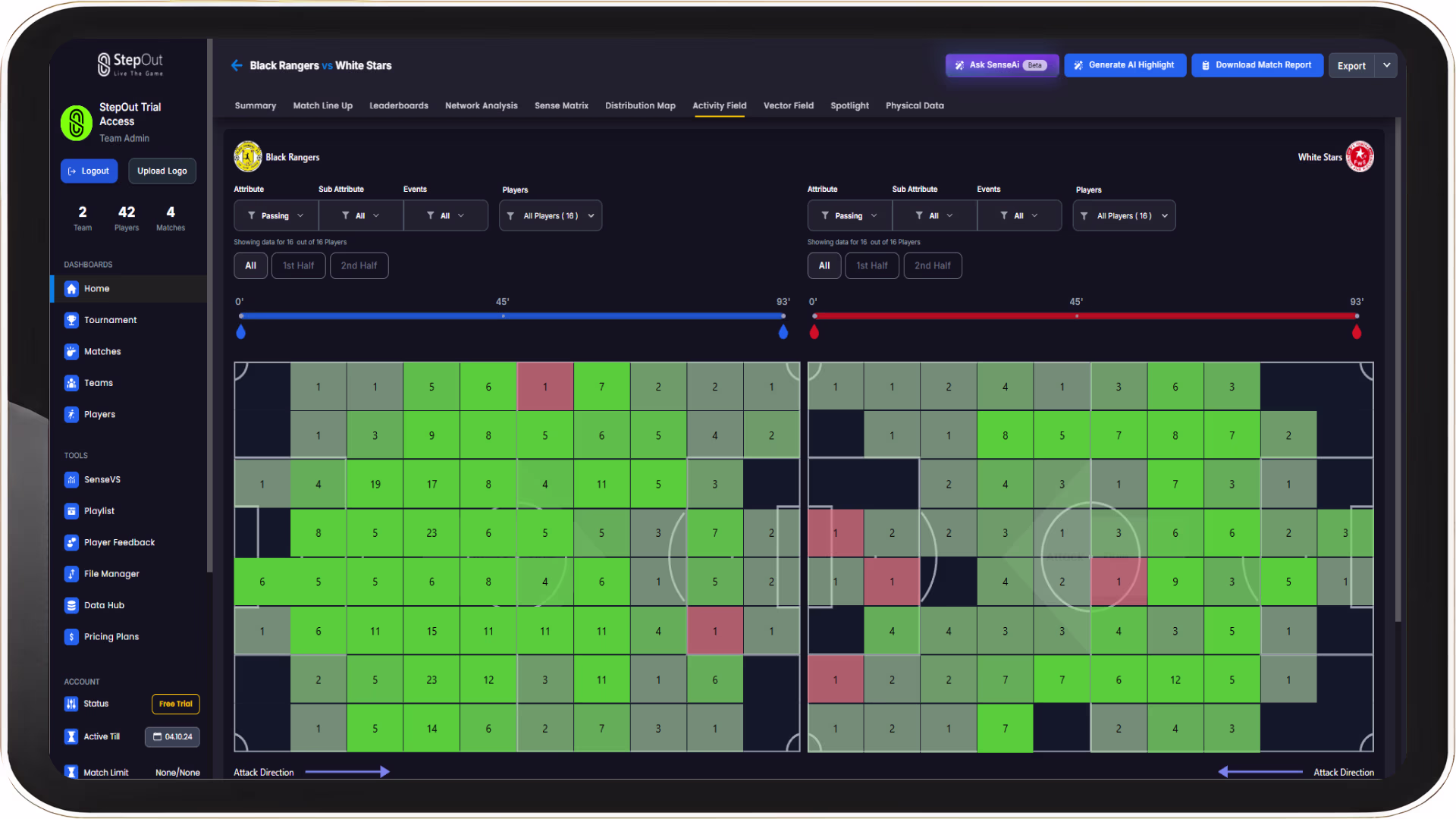Activity Map visualizes player actions and engagement across the pitch, revealing movement patterns and key zones. Analyze game dynamics to refine tactics and enhance performance.